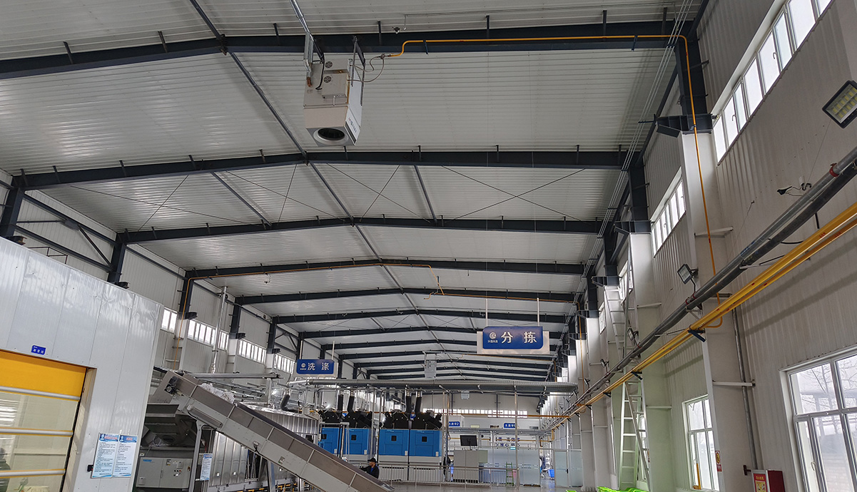 解決高大空間(高:4-30m)的供暖需求。采用燃?xì)獗P管內(nèi)燃?xì)庵苯尤紵訜峥諝猓訜岷托嘛L(fēng)功能于一體,新風(fēng)量可變,混合或新風(fēng)運行。