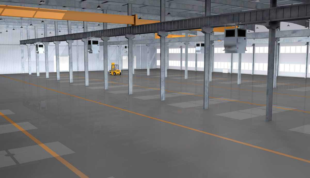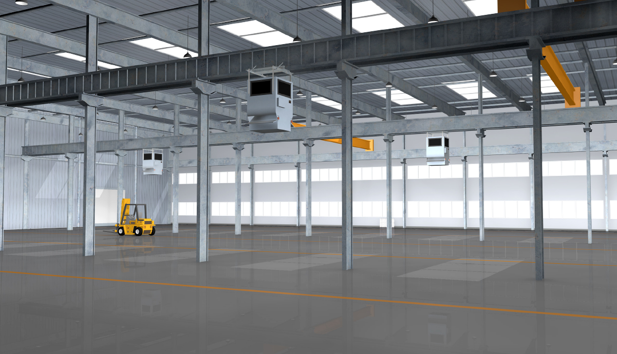 利用安裝于頂部的大風壓軸流風機強制熱空氣下送,熱空氣經過消音海綿和下部梯形收口兩次提壓后,經導流葉片導向后從噴口旋流而出,至上而下將熱空氣均勻分布到空間各處。
